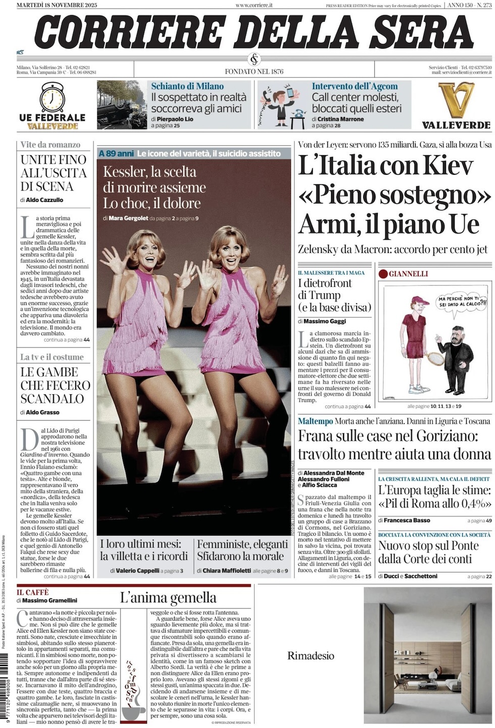“Le gemelle unite fino alla fine”, di Aldo Cazzullo: “La storia prima meravigliosa e poi drammatica delle gemelle Kessler, unite nella danza della vita e in quella della morte, sembra scritta dal più fantasioso dei romanzieri. Nessuno dei nostri nonni avrebbe immaginato nel 1945, in un’Italia devastata dagli invasori tedeschi, che sedici anni dopo due artiste tedesche avrebbero avuto un enorme successo, grazie a un’invenzione tecnologica che appariva una diavoleria ed era la modernità: la televisione. Il mondo era davvero cambiato”.