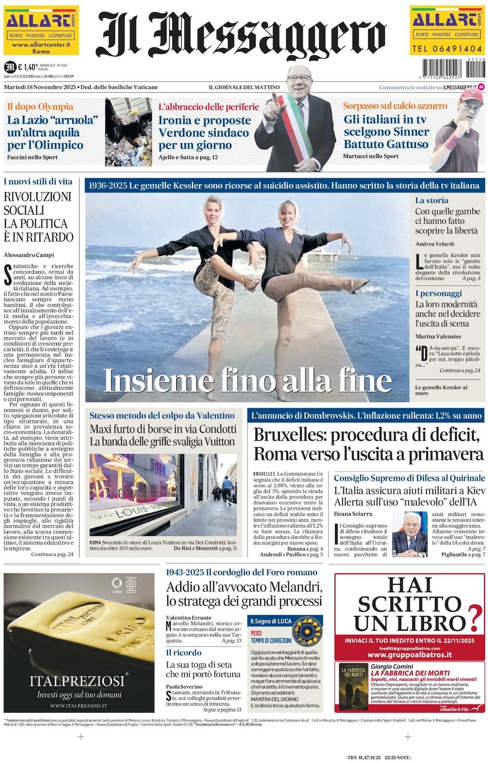 “Libertà è scegliere fino alla fine”, di Mario Sechi: “La morte delle sorelle Kessler riporta in prima pagina il tema del “fine vita” che sul nostro giornale abbiamo sempre declinato con la libertà di coscienza. So che la libertà è tale quando incontra dei limiti e non lede i diritti degli altri, ma nel momento in cui si gioca l’ultima mano della partita della vita, vorrei poter morire come voglio. Capisco che questo possa essere letto come un atto di supremo egoismo – per l’impossibile liberazione dal ricordo e per il dolore che lascia intorno a chi ci ha amato ma il dolore (anche quello esistenziale), il declino fisico, la sofferenza nella malattia, possono diventare un peso insopportabile, un’umiliazione infinita della carne e dello spirito”.