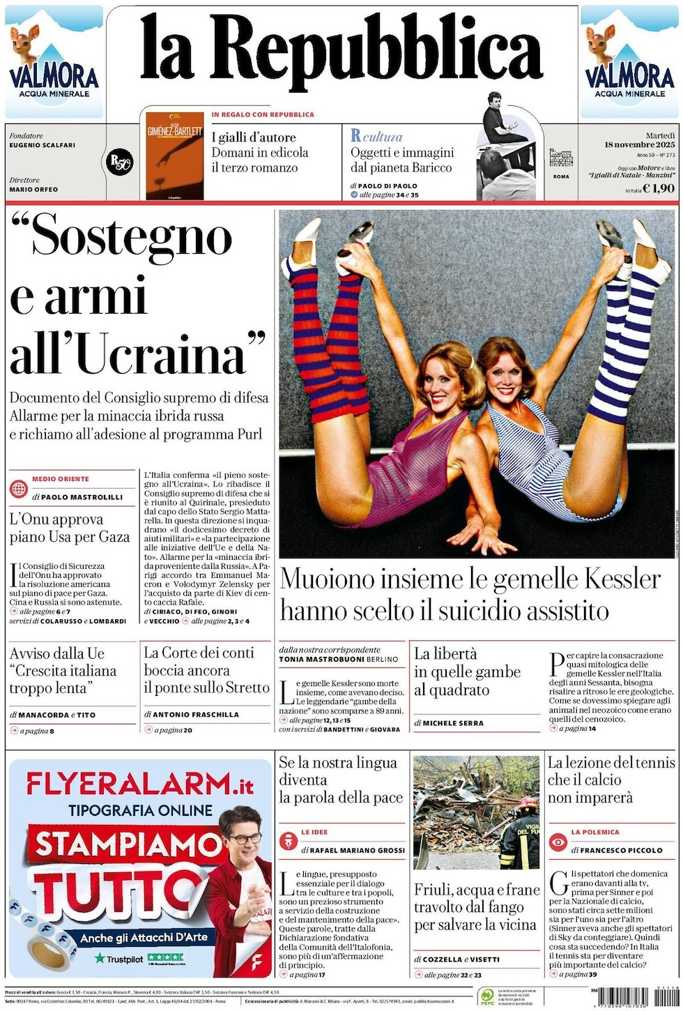 La notizia principale di oggi in apertura sui quotidiani è quella relativa agli aiuti all’Ucraina, con l’Italia che ribadisce il pieno sostegno a Kiev mentre la Francia invia altri 100 jet e la presidente della Commissione europea Ursula von der Leyen lavora a un piano da 135 miliardi. In evidenza anche la morte delle gemelle Kessler, che a 89 anni hanno scelto di morire insieme con una forma di suicidio assistito. “L’Europa cresce, l’Italia rallenta”, titola La Stampa. “L’Italia con Kiev: ‘Pieno sostegno’. Armi, il piano Ue”, è l’apertura del Corriere. “L’eutanasia delle Kessler”, è invece la prima pagina di LIbero.