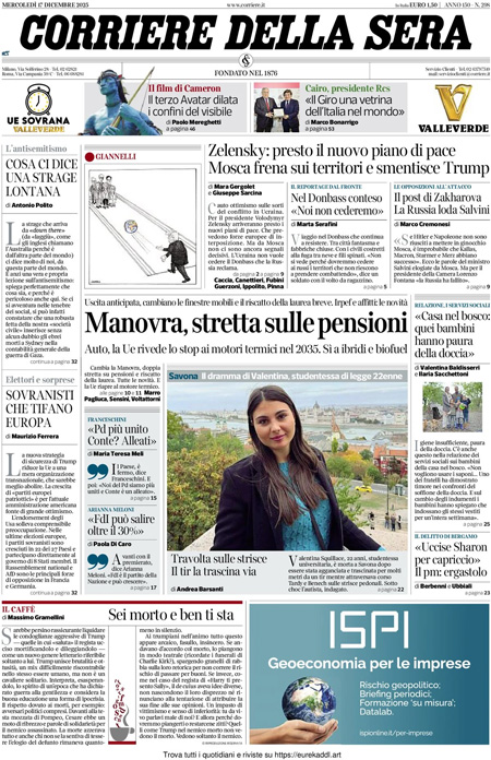 L'EDICOLA, Il Corriere: "Manovra, stretta sulle pensioni". La Stampa: "Putin vuole soltanto la guerra". Il Giornale: "Retromarcia Europa: stop all'auto green. Finisce l'era Greta" - Blitz Quotidiano