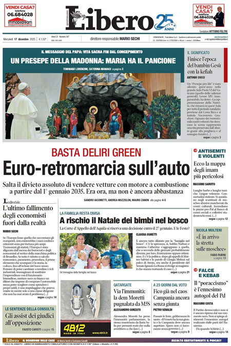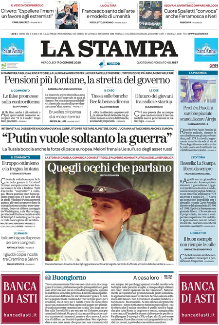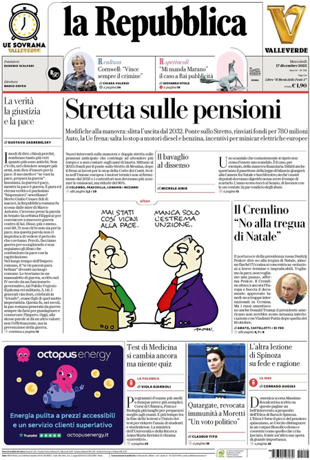 Sono diverse le notizie di oggi in apertura sui quotidiani: le modifiche alla proposta di legge di bilancio presentate dal governo riguardo le regole più restrittive sulle pensioni, il piano per il settore automobilistico approvato ieri dalla Commissione europea che revoca il divieto di vendita di nuove auto a benzina o diesel dopo il 2035, e il no di Putin che gela i negoziati per far finire la guerra in Ucraina. “Putin vuole soltanto la guerra”, titola La Stampa. “Manovra, stretta sulle pensioni”, è l’apertura del Corriere. “Retromarcia Europa: stop all’auto green. Finisce l’era Greta”, titola invece Il Giornale.