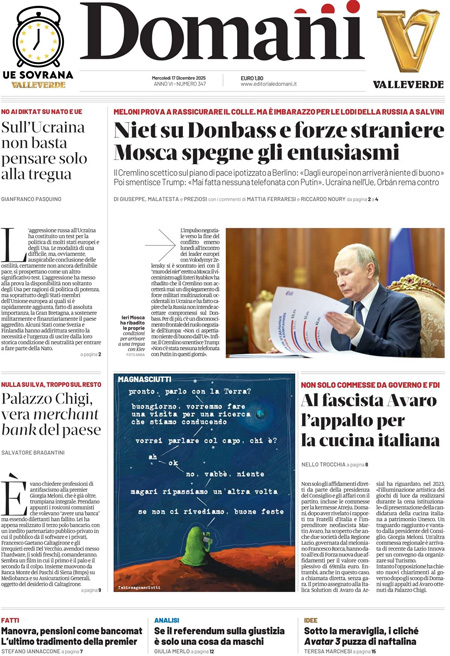 “Unione sovietica europea”, di Marco Travaglio: “Nella foga di combattere le autocrazie copiandole, la nostra bella Ue ci ha regalato un’altra perla di liberaldemocrazia: sanzioni a 12 complici della guerra ibrida russa. Tra i fortunati vincitori c’è Jacques Baud, ex colonnello svizzero dell’esercito e dell’intelligence, ex consigliere Onu, uno degli analisti militari più documentati sull’Ucraina”.