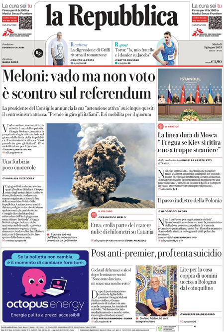 “Meloni: vado ma non voto. È scontro sul referendum” (La Repubblica).