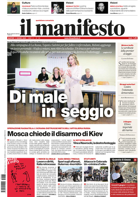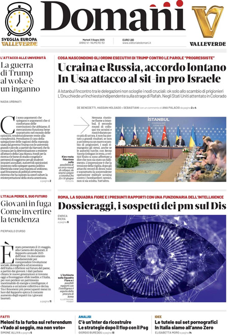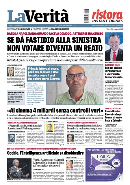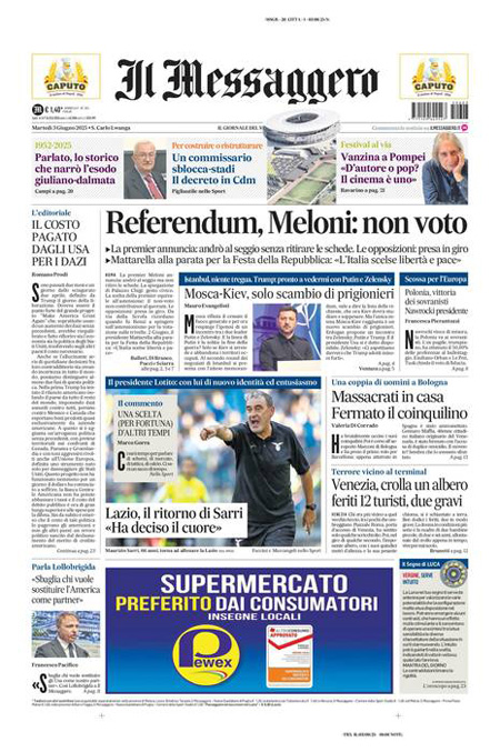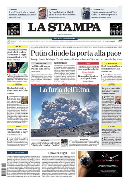 Sono due le notizie principali di oggi in apertura sui quotidiani: le parole della presidente del Consiglio Giorgia Meloni, che riguardo ai referendum di domenica e lunedì prossimi ha dichiarato la sua partecipazione al seggio senza però ritirare le schede per votare; l’incontro che si è tenuto a Istanbul fra Russia e Ucraina e che non ha portato ad alcun risultato concreto. “Putin chiude la porta alla pace”, titola La Stampa. “Meloni: al seggio per i referendum ma non voterò”, è l’apertura del Corriere della Sera. “Se dà fastidio alla sinistra non votare diventa un reato”, titola invece La Verità.