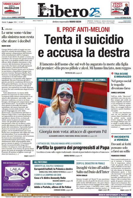 “Le urne sono vicine, alla sinistra non resta che alzare i decibel”. L’editoriale di Mario Sechi: “Giorgia Meloni andrà al seggio ma non ritirerà le schede dei referendum, è una delle opzioni a disposizione dell’elettore nella consultazione dell’8 e 9 giugno: esercito il mio diritto di andare a votare, ma sottolineo che nessuno dei quesiti merita il mio voto, è un giudizio politico forte, più efficace della semplice astensione e non concorre alla formazione del quorum”.