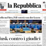 “Musk contro i giudici italiani” titola il Corriere della Sera. La Repubblica: “Musk contro i giudici. Attacco dopo la bocciatura del decreto del governo”. Libero ironizza e attacca: “Marziani rossi contro Musk”.