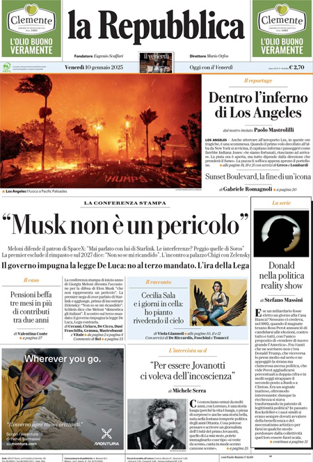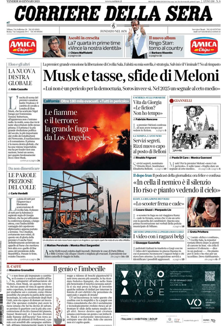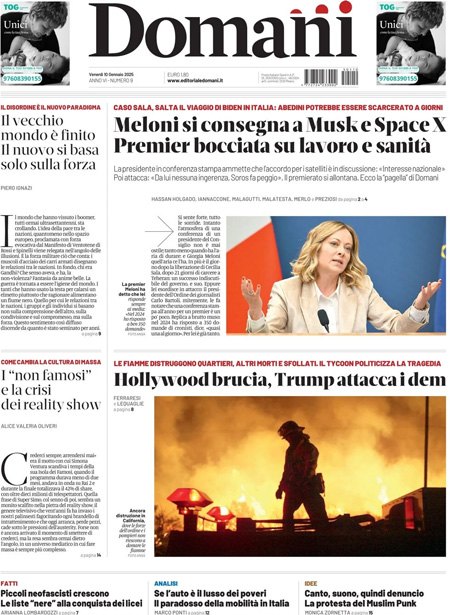 Home » L’EDICOLA, il Corriere: “Musk e tasse, sfide di Meloni”. Il Manifesto: “Giù la Musk”. Libero: “Meloni 2032. Panico a sinistra”. Domani: “Meloni si consegna a Musk e Space X”