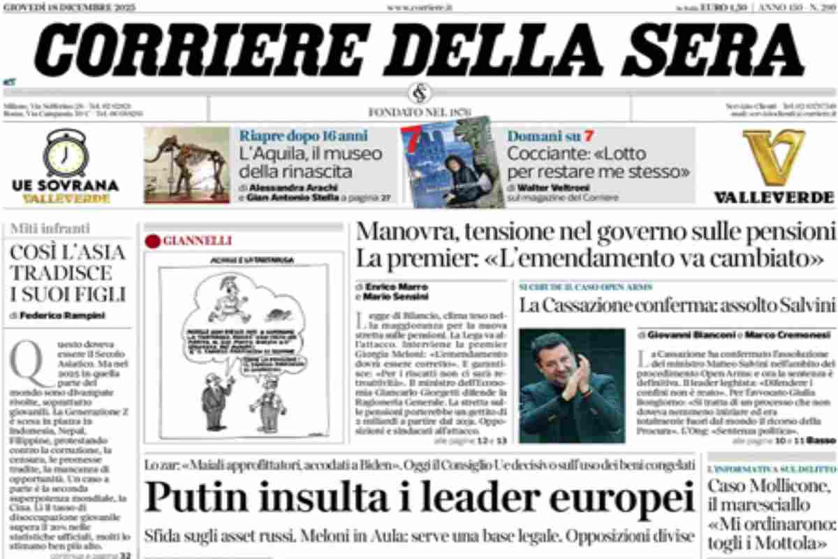 Sono diverse le notizie di oggi in apertura sui quotidiani: le comunicazioni della presidente del Consiglio Meloni in parlamento in vista del Consiglio europeo, nel quale si parlerà degli aiuti all’Ucraina, le critiche del presidente russo Putin nei confronti dei leader europei, definiti “porcellini approfittatori”, e le discussioni riguardo alle norme sulle pensioni contenute negli emendamenti alla legge di bilancio. Spazio anche al caso Open Arms, con l’assoluzione in Cassazione di Matteo Salvini. “Beni russi, Europa spaccata. Meloni: Putin irragionevole”, titola La Stampa. “Putin insulta i leader europei”, è l’apertura del Corriere. “La strategia della pensione”, è la prima pagina del Fatto Quotidiano.