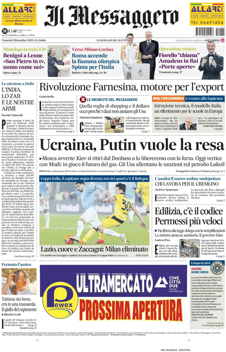 L'EDICOLA, Il Corriere: "Putin: Kiev fuori dal Donbass o userò la forza. E Trump attenua le sanzioni ai russi di Lukoil". Il Messaggero: "Ucraina, Putin vuole la resa". La Verità: "Prima ti portano via i figli poi vedono se c'è un motivo" - Blitz Quotidiano