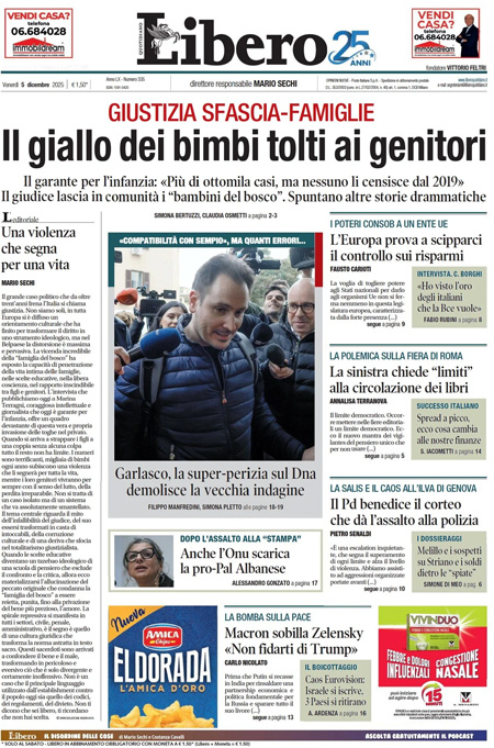 “Una violenza che segna per una vita”, di Mario Sechi: “Il grande caso politico che da oltre trent’anni frena l’Italia si chiama giustizia. Non siamo soli, in tutta Europa si è diffuso un orientamento culturale che ha finito per trasformare il diritto in uno strumento ideologico, ma nel Belpaese la distorsione è massima e pervasiva. La vicenda incredibile della “famiglia del bosco” ha esposto la capacità di penetrazione della vita intima delle famiglie, nelle scelte educative, nella libera coscienza, nel rapporto inscindibile tra figli e genitori”.