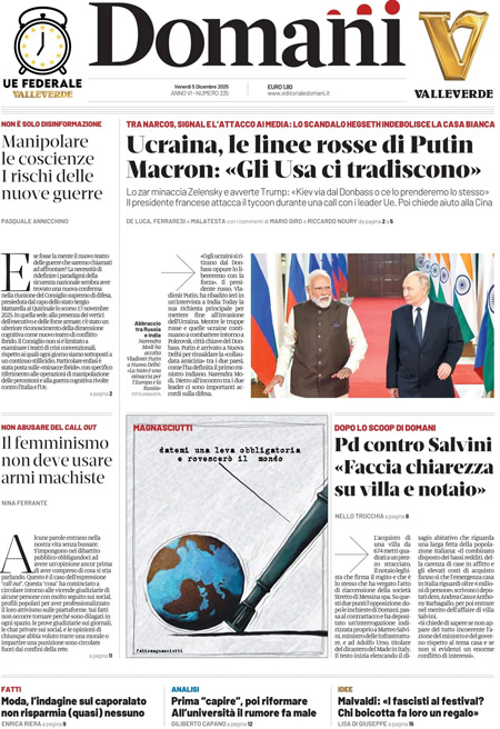 “Ucraina, le linee rosse di Putin. Macron: Gli Usa ci tradiscono” (Domani).