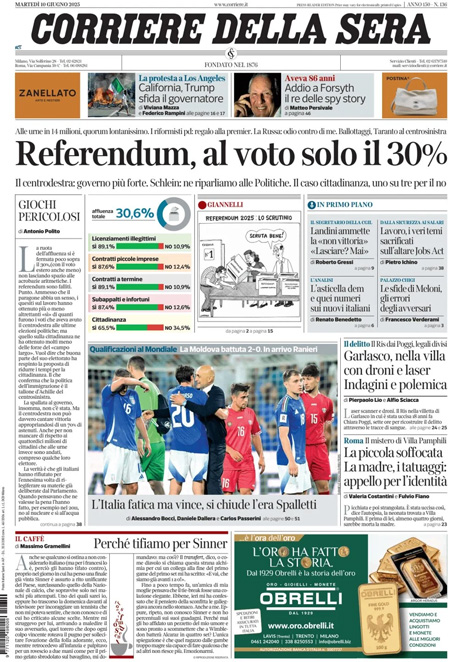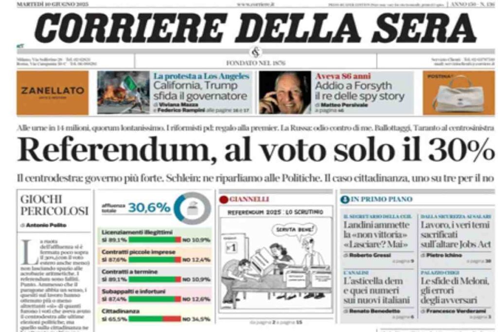“Giochi pericolosi”. L’editoriale di Antonio Polito: “La ruota dell’affluenza si è fermata poco sopra il 30%,(con il voto estero anche meno) non lasciando spazio alle acrobazie aritmetiche. I referendum sono falliti. Punto. Ammesso che il paragone abbia un senso, i quesiti sul lavoro hanno ottenuto più o meno altrettanti «sì» di quanti furono i voti che aveva avuto il centrodestra alle ultime elezioni politiche; ma quello sulla cittadinanza ne ha ottenuto molti meno delle forze del «campo largo». Vuol dire che buona parte del suo elettorato ha respinto la proposta di ridurre i tempi per la cittadinanza. Il che conferma che la politica dell’immigrazione è il tallone d’Achille del centrosinistra. La spallata al governo, insomma, non c’è stata. Ma il centrodestra non può davvero cantare vittoria appropriandosi di un 70% di astenuti”.