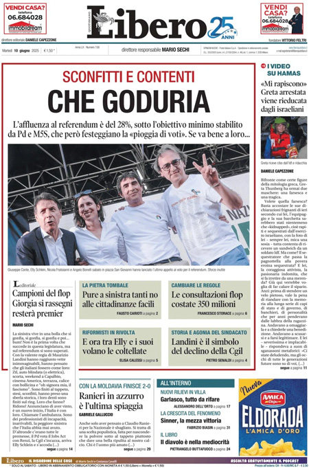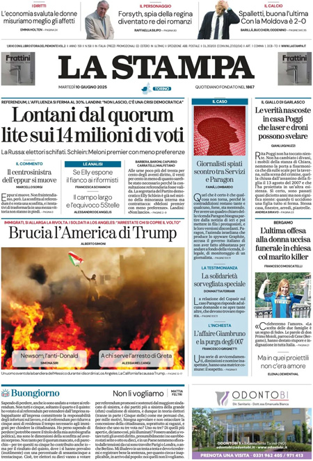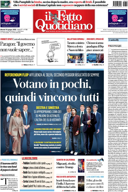 La notizia principale di oggi in apertura sui quotidiani è quella relativa al fallimento dei referendum su lavoro e cittadinanza per cui si è votato domenica e lunedì. Alle urne in 14 milioni e urne lontanissime. “Lontani dal quorum. Lite sui 14 milioni di voti”, titola La Stampa. “Referendum, al voto solo il 30%”, è l’apertura del Corriere della Sera. “Votano in pochi, quindi vincono tutti”, è invece la prima pagina del Fatto Quotidiano.
