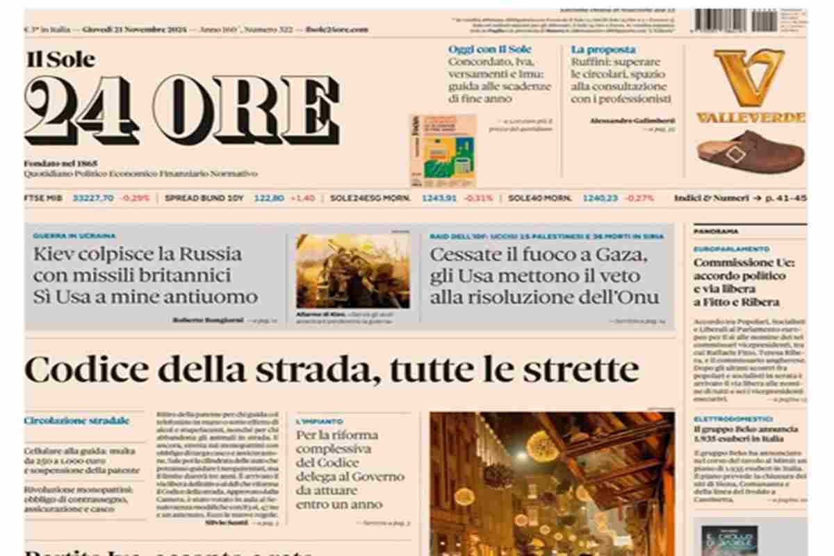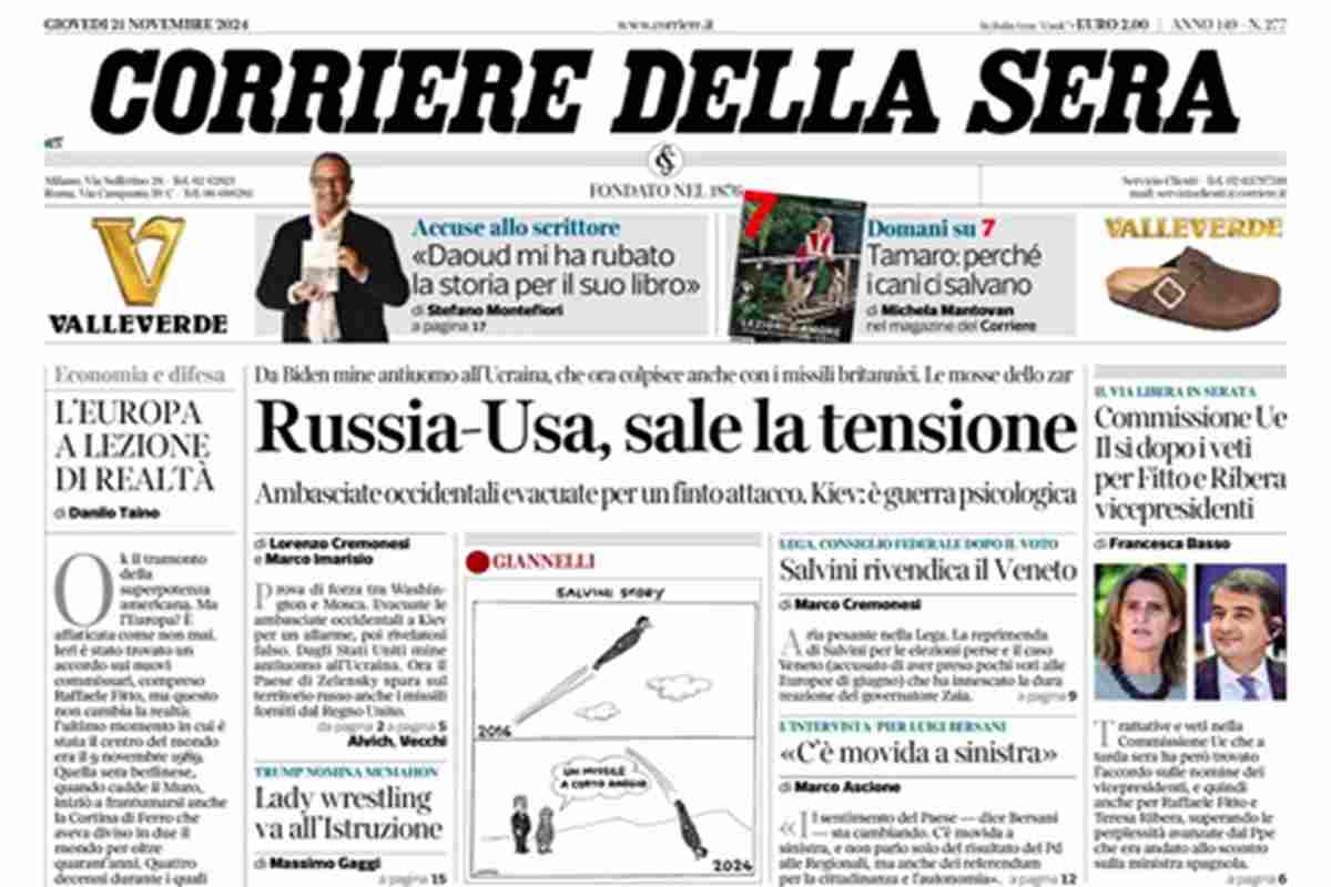 “Russia-Usa, sale la tensione” titola il Corriere della Sera. Anche La Stampa apre sulla guerra: “”Ucraina, orrore mine anti-uomo”. La Repubblica invece apre sull’accordo trovato in Europa: “Via libera a Fitto”.