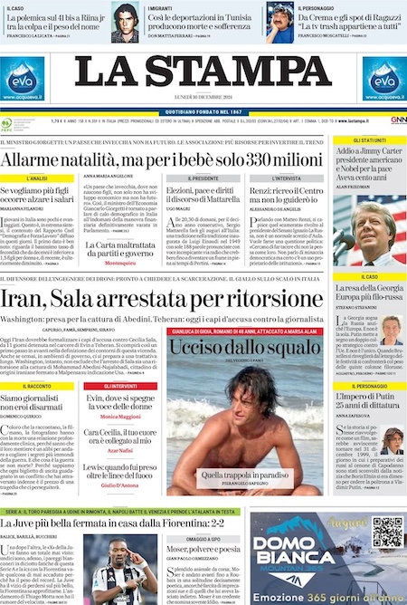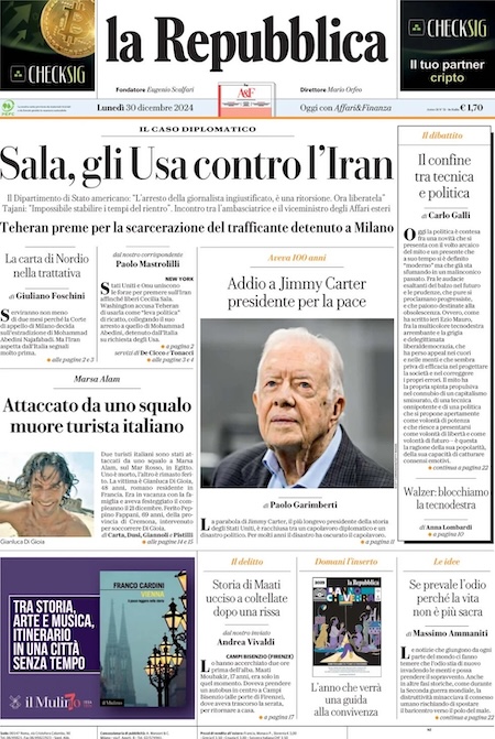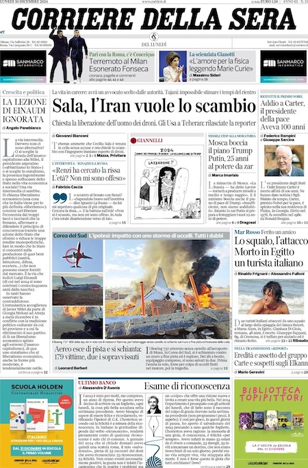 Le trattative per la liberazione della giornalista Cecilia Sala. È questo l’argomento principale sulle prime pagine di oggi. “Sala, gli Usa contro l’Iran” è l’apertura di Repubblica. “Iran, Sala arrestata per ritorsione” titola la Stampa. Sullo stesso tema, Libero: “Sequestrata in Iran ma accusano gli Usa e Meloni”.
