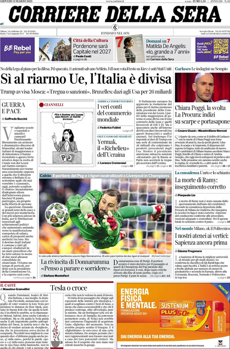 “Sì al riarmo Ue, l’Italia è divisa” (Il Corriere della Sera).
