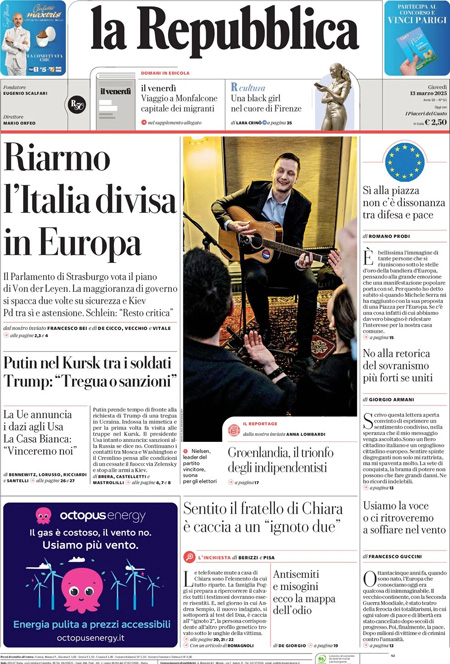 “Riarmo, l’Italia divisa in Europa” (La Repubblica).