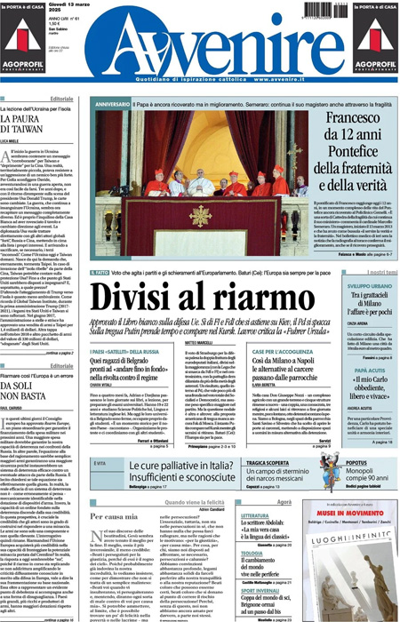 La notizia principale di oggi in apertura sui quotidiani è quella del voto del Parlamento europeo sulle due risoluzioni su difesa comune e piano di riarmo presentato dalla presidente della Commissione europea Ursula von der Leyen e sul sostegno europeo all’Ucraina. Entrambe sono state approvate, ma con divisioni tra i partiti di maggioranza e all’intento del Partito democratico. “Tregua, Trump minaccia Putin”, titola La Stampa. “Sì al riarmo Ue, l’Italia è divisa”, è l’apertura del Corriere della Sera. “L’Europa dichiara guerra alla pace”, è invece la prima pagina del Fatto Quotidiano.