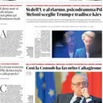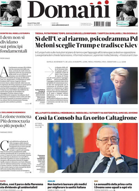 “Sì dell’Ue al riarmo, psicodramma Pd. Meloni sceglie Trump e tradisce Kiev” (Domani).