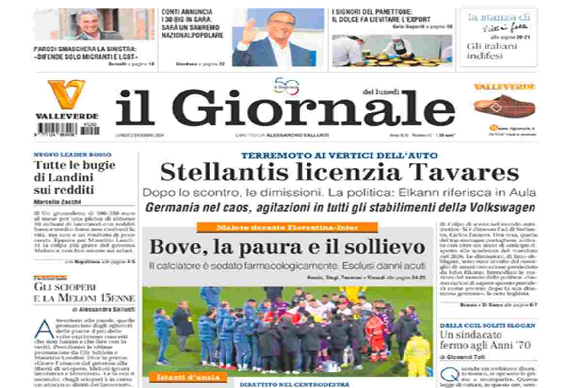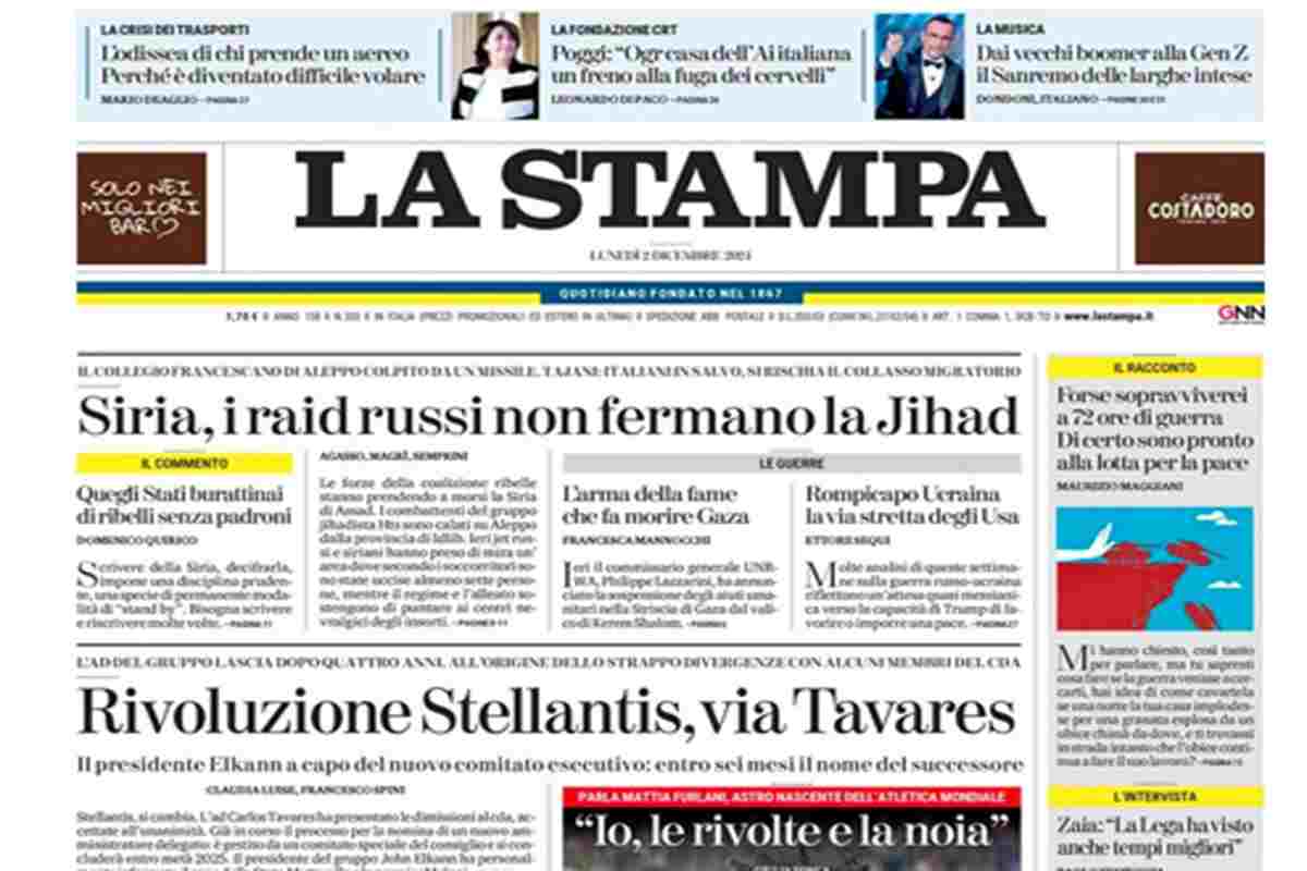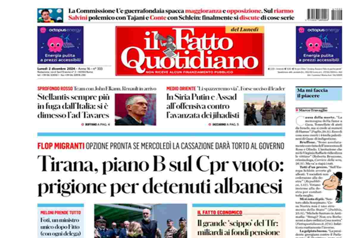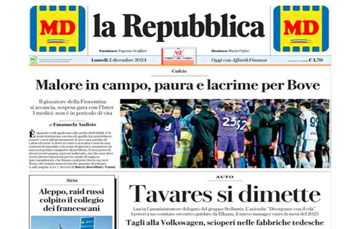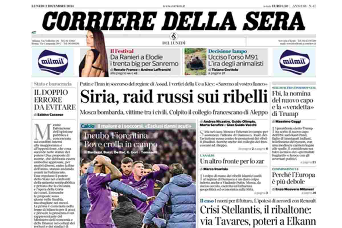 I combattimenti in Siria, il malore in campo di Edoardo Bove e le dimissioni di Tavares sono gli argomenti principali sulle prime pagine di oggi. “Siria, raid russi sui ribelli” titola il Corriere della Sera. La Repubblica invece apre sul malore di Bove: “Malore in campo, paura e lacrime per Bove”. Il Fatto Quotidiano dedica la prima pagina al centro migranti in Albania: “Tiran, piano B sul Cpr vuoto: prigione per detenuti albanesi”.