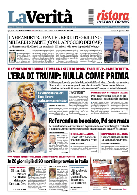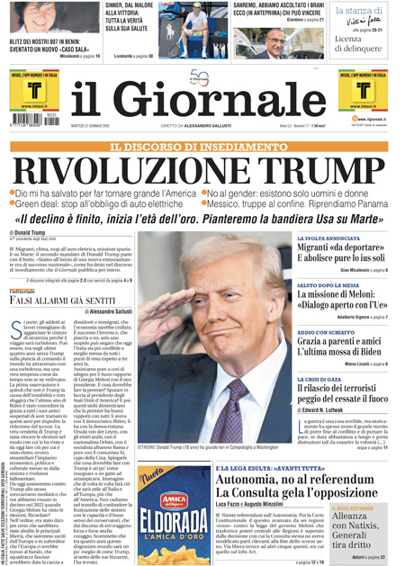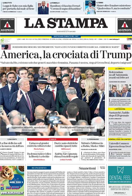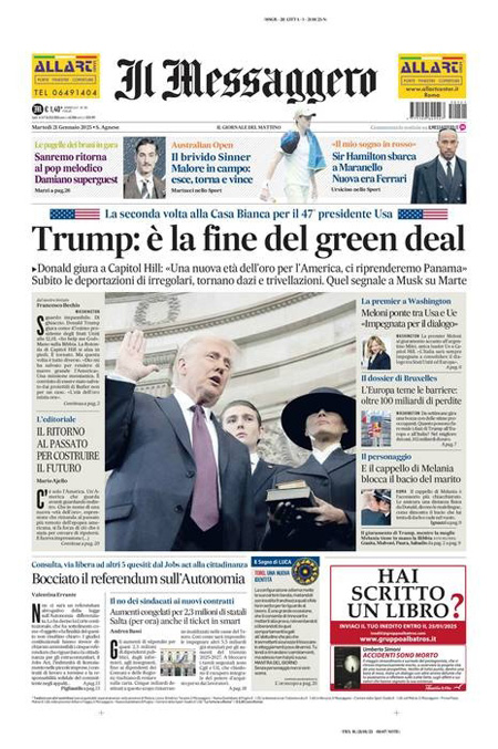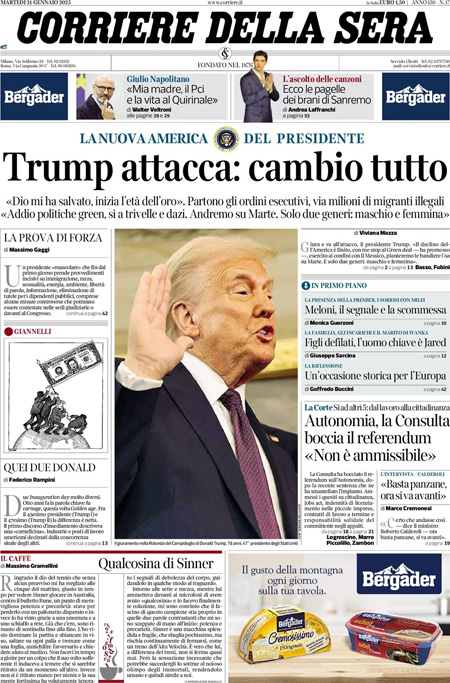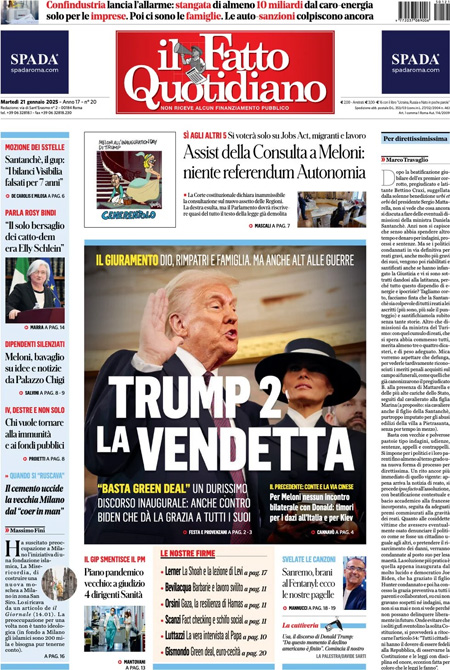 La cerimonia di insediamento di Donald Trump è l’argomento principale sulle prime pagine di oggi. “Trump attacca – è la prima pagina del Corriere della Sera – cambio tutto”. Titolo identico per Repubblica e Fatto Quotidiano: “Trump 2, la vendetta”.