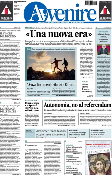 “Trump, uno tsunami sulle democrazie” è l’editoriale di Massimo Molinari: “Il presidente torna alla Casa Bianca con un discorso tutto all’attacco in cui promette di rifondare l’America su immigrazione, economia e famiglia”.