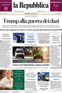 Le prime decisioni del neo presidente Donald Trump sono l’argomento principale sulle prime pagine di oggi. “Trump corre, valanga di decreti” è la prima pagina del Corriere della Sera. “Trump alla guerra dei dazi” è l’apertura di Repubblica. “America contro tutti” è invece il titolo di apertura della Stampa.