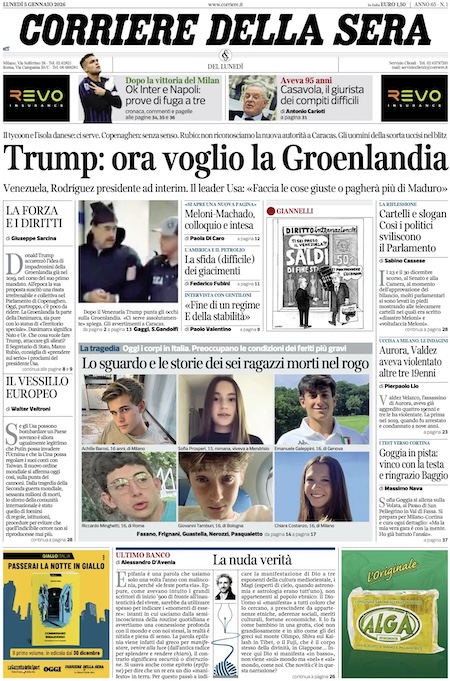 L'EDICOLA, Il Corriere: "Trump: ora voglio la Groenlandia". Il Messaggero: "Supertestimone contro Maduro". Il Fatto: "Il trio Ursula, Kallas e Meloni sta con l'aggressore (se è Usa)" - Blitz Quotidiano