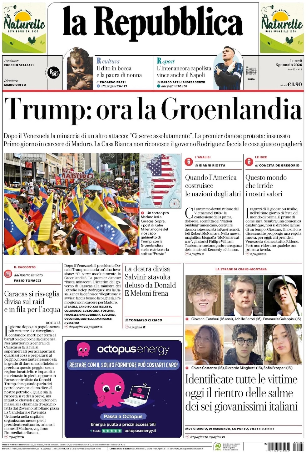 “Trump: ora la Groenlandia” (La Repubblica).