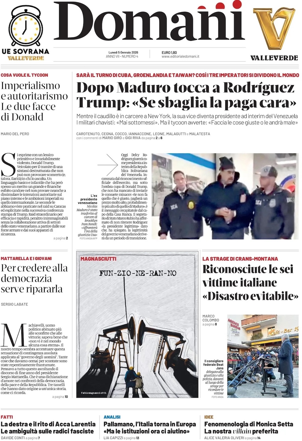“Dopo Maduro tocca a Rodriguez. Trump: se sbaglia la paga cara” (Domani).