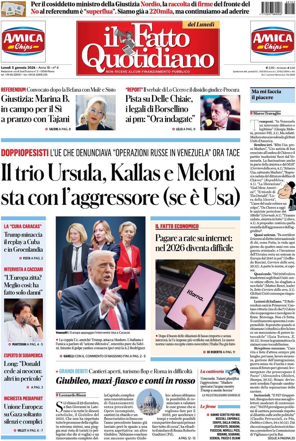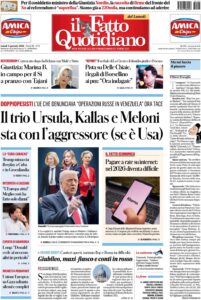 “Il trio Ursula, Kallas e Meloni sta con l’aggressore (se è Usa)” (Il Fatto Quotidiano).