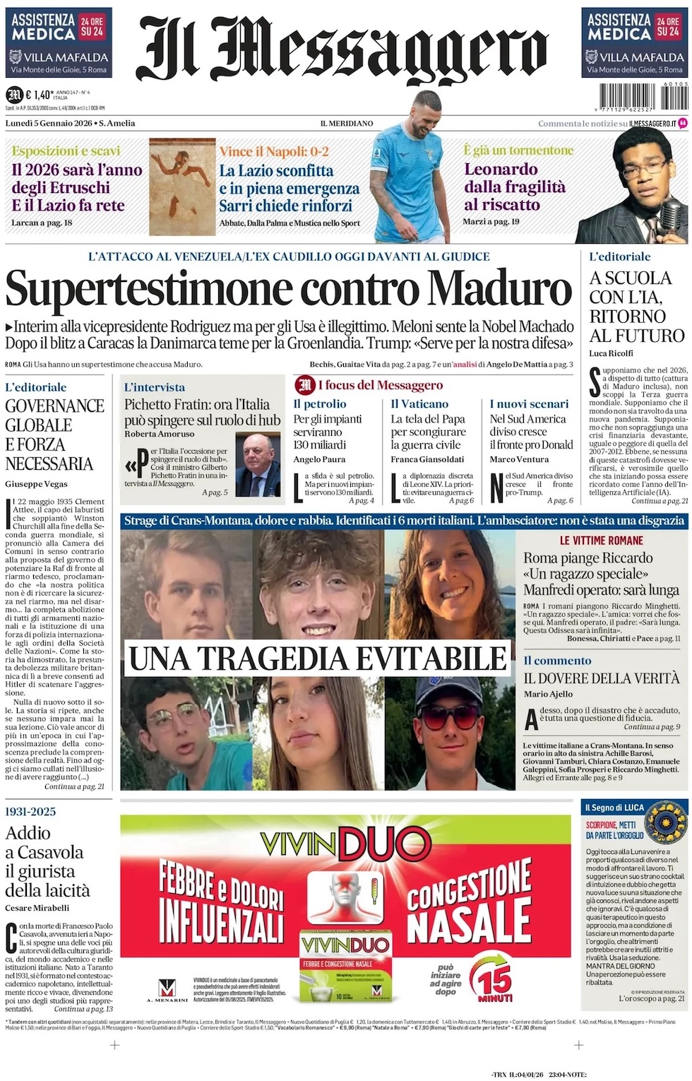 Prime pagine di oggi dedicate al presidente degli Stati Uniti Donald Trump, alla sua volontà di controllare la Groenlandia e all’operazione con cui è stato rimosso il presidente venezuelano Nicolás Maduro. “Supertestimone contro Maduro”, titola Il Messaggero. “Trump: ora voglio la Groenlandia”, è l’apertura del Corriere. “Il trio Ursula, Kallas e Meloni sta con l’aggressore (se è Usa)”, è invece la prima pagina del Fatto Quotidiano.