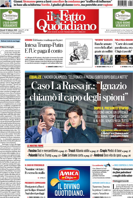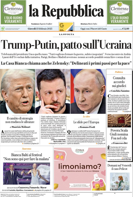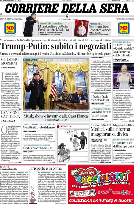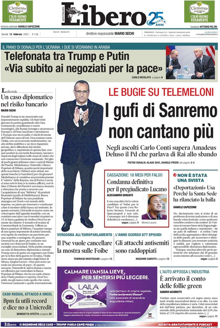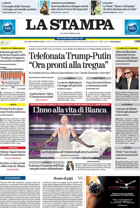 La principale notizia di oggi sui quotidiani è quella della telefonata fra il presidente degli Stati Uniti Trump e quello russo Putin per iniziare i negoziati e una tregua nella guerra fra Russia e Ucraina. “Trump-Putin: subito i negoziati”, titola il Corriere della Sera. “Telefonata Trump-Putin. Ora pronti alla tregua”, titola invece La Stampa. “I gufi di Sanremo non cantano più”, è l’apertura di Libero.