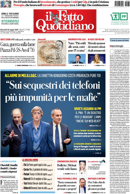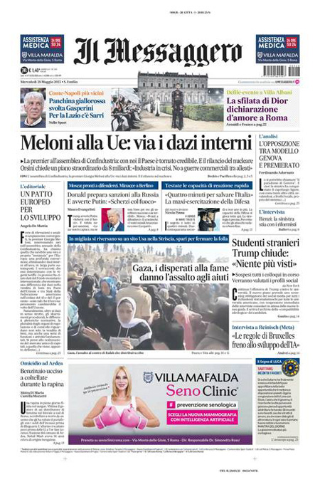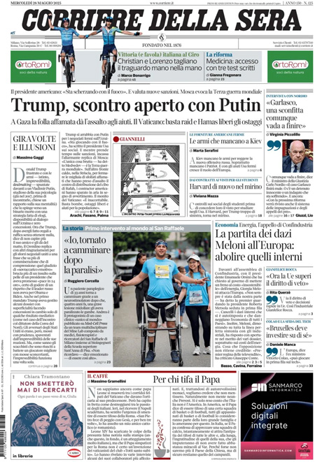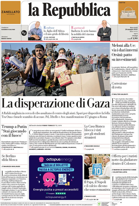 Sono diverse le notizie di oggi in apertura sui quotidiani: l’assemblea annuale di Confindustria; gli aiuti nella Striscia di Gaza e la confusione della gestione da parte della Gaza Humanitarian Foundation; le critiche del presidente Donald Trump a Vladimir Putin per gli ostacoli nei negoziati con l’Ucraina. “Trump, scontro aperto con Putin”, titola Il Corriere della Sera. “La disperazione di Gaza”, è l’apertura di Repubblica. “La sinistra usa Gaza per il referendum”, è invece la prima pagina di Libero.