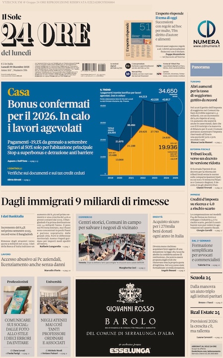 “Casa, bonus confermati per il 2026. In calo i lavori agevolati” (Il Sole 24 Ore).