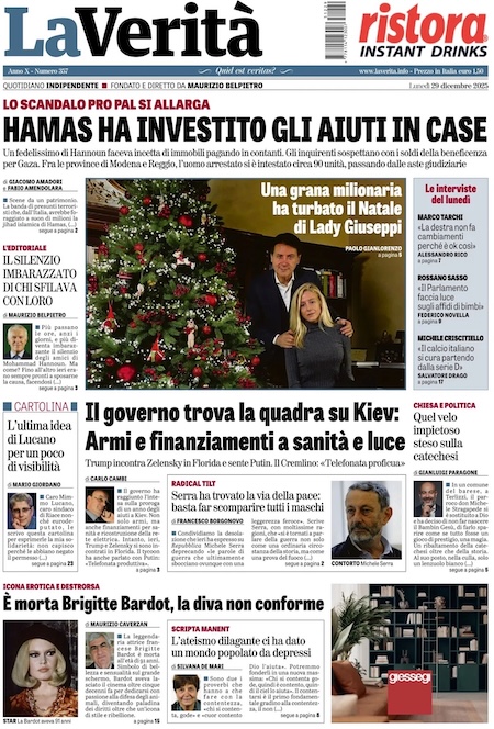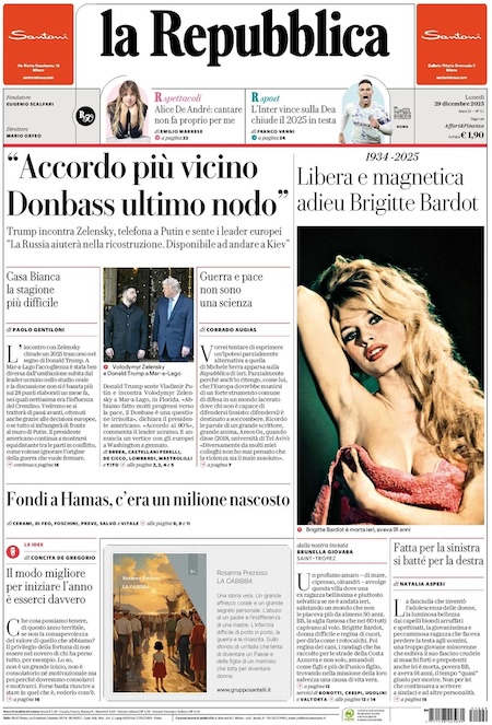 La notizia principale di oggi in apertura sui quotidiani è quella relativa all’incontro tra il presidente statunitense Donald Trump e quello ucraino Volodymyr Zelensky. Si è discusso del piano di pace per far finire la guerra e la sovranità sulla regione del Donbas rimane il punto più critico e problematico. “Accordo più vicino. Donbass ultimo nodo”, è la prima pagina di Repubblica. “Hamas ha investito gli aiuti in case”, titola La Verità. “Trump spinge, la svolta non c’è”, è l’apertura del Corriere.