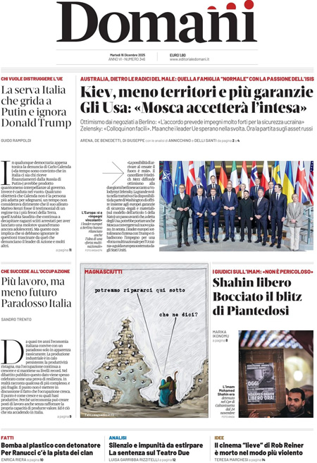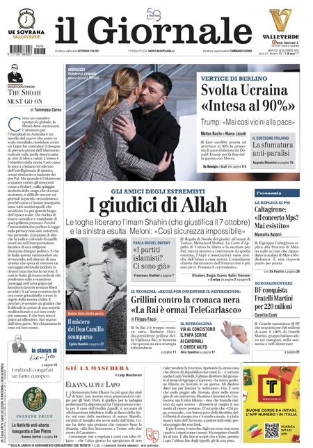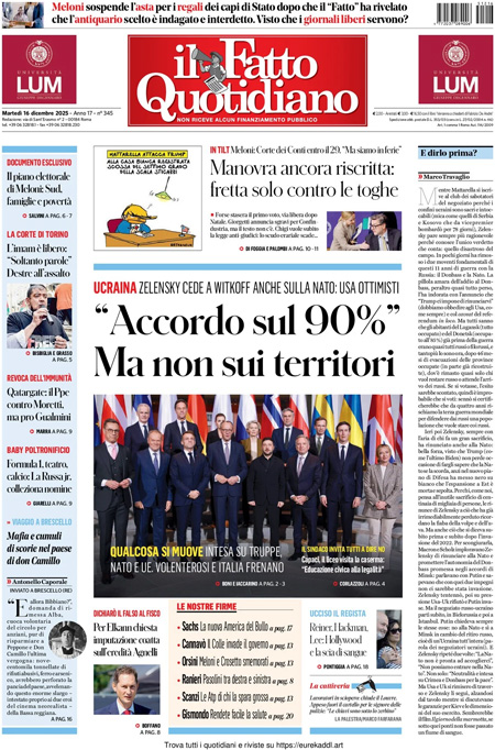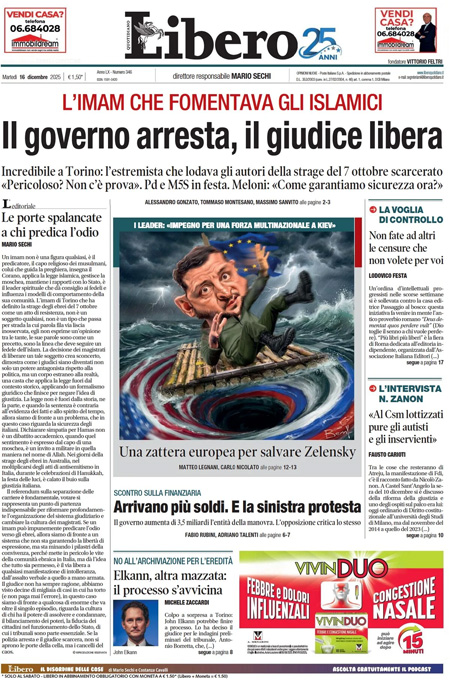 La notizia principale di oggi in apertura sui quotidiani è quella relativa all’incontro fra il presidente ucraino Zelensky, i principali leader europei e l’inviato degli Stati Uniti Steve Witkoff per cercare di raggiungere un accordo per la fine della guerra fra Russia e Ucraina. “Trump: mai così vicini alla pace”, è l’apertura di Repubblica. “Ucraina, spiragli per la pace”, è la prima pagina del Corriere. “I giudici liberano l’imam che tifa stragi”, titola invece La Verità.