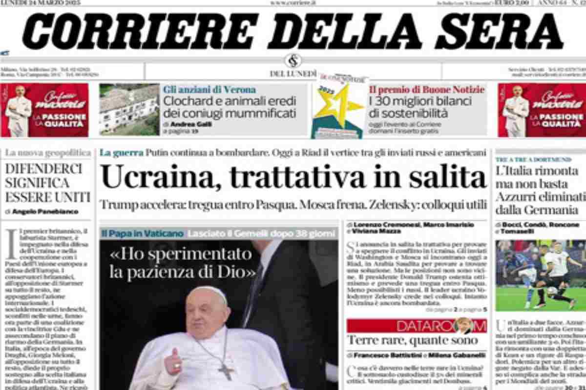 Sono due le notizie principali di oggi in apertura suoi quotidiani: le trattative per arrivare a una tregua fra Russia e Ucraina e le dimissioni di Papa Francesco dall’ospedale Gemelli dopo quasi quaranta giorni di ricovero. “L’America riabilita Putin”, titola La Stampa. “Ucraina, trattativa in salita”, è l’apertura del Corriere della Sera. “Alla sinistra prudono le mani”, è invece la prima pagina di Libero.
