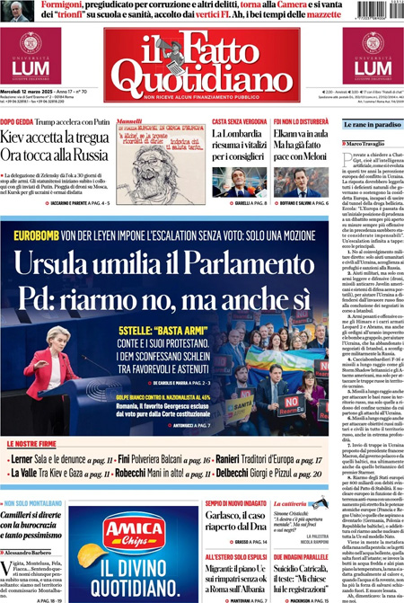 “Ursula umilia il Parlamento. Pd: riarmo no, ma anche sì” (Il Fatto Quotidiano).