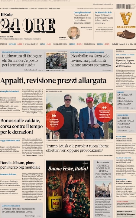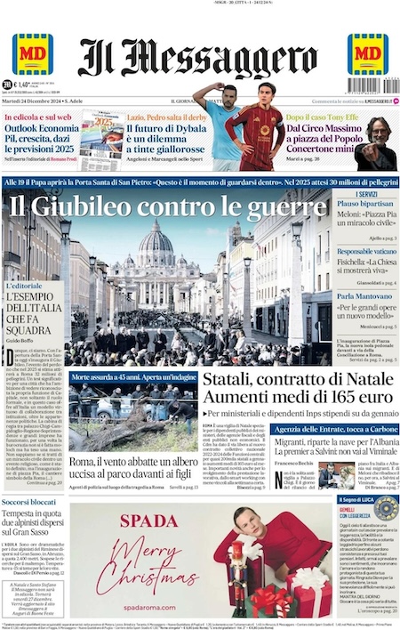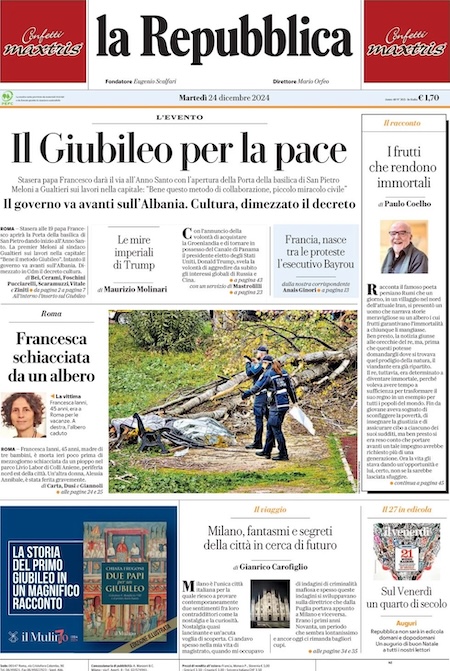 Home » L’EDICOLA, la Repubblica: “Il Giubileo per la pace”. Il Fatto Quotidiano: “Regali di Natale: più armi, meno indagini, treni fermi”