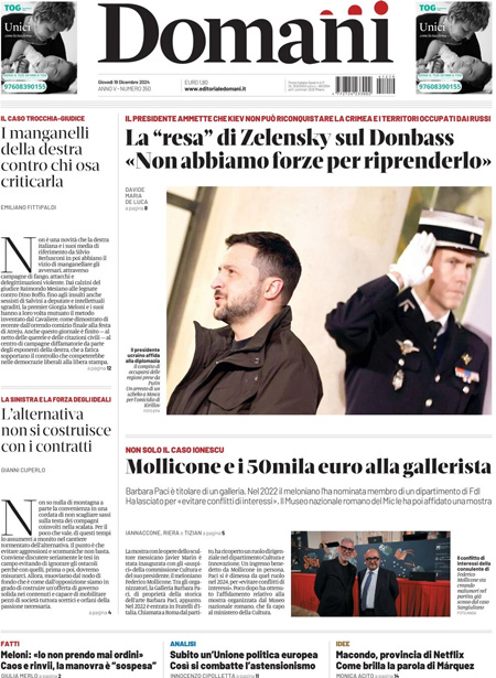 “La svolta di Zelensky” titola Repubblica. “Pace in Ucraina, Zelensky apre” è l’apertura della Stampa. Tutti altri toni sul Fatto Quotidiano: “Abbiamo perso la guerra”.