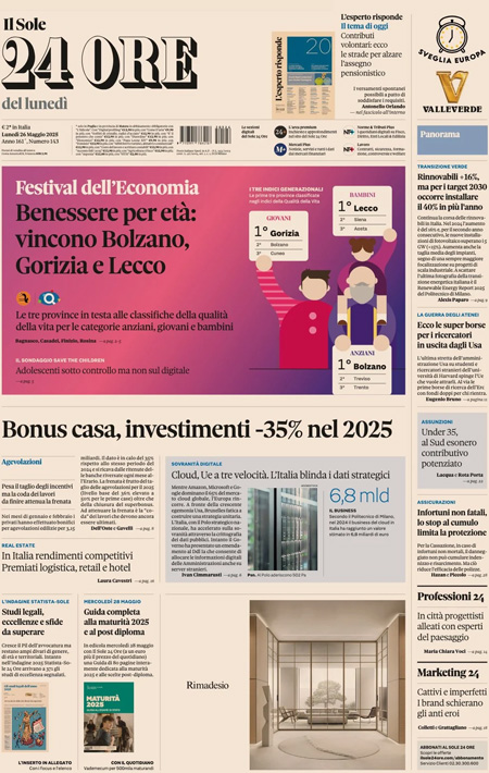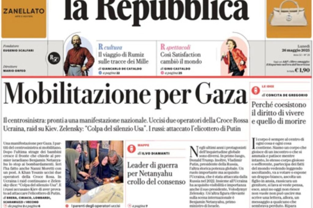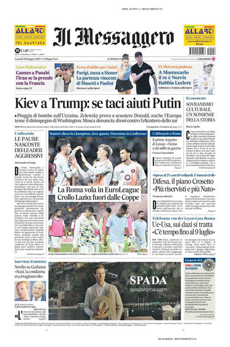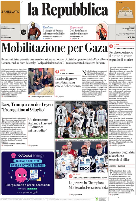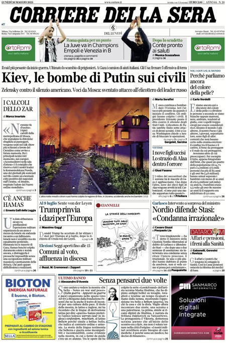 Le prime pagine dei principali quotidiani italiani di oggi sono dominate dalla guerra tra Russia e Ucraina. Nella notte tra sabato e domenica, si sono verificati violenti bombardamenti russi su diverse città ucraine, intensificando ulteriormente il conflitto. Mosca ha accusato Kiev di aver tentato di abbattere l’elicottero a bordo del quale si trovava il presidente Vladimir Putin, un’accusa che contribuisce ad alimentare la tensione internazionale. Nel frattempo, il presidente ucraino Volodymyr Zelensky ha rivolto un nuovo appello al suo omologo statunitense, Donald Trump, chiedendogli di esercitare pressioni sulla Russia per ottenere una tregua e aprire un dialogo diplomatico. Accanto a queste notizie di politica estera, la Repubblica dedica l’apertura alle reazioni italiane riguardo alla crisi nella Striscia di Gaza, mentre la Verità concentra l’attenzione sulla trattativa in corso tra Stati Uniti e Unione Europea per la riduzione dei dazi.