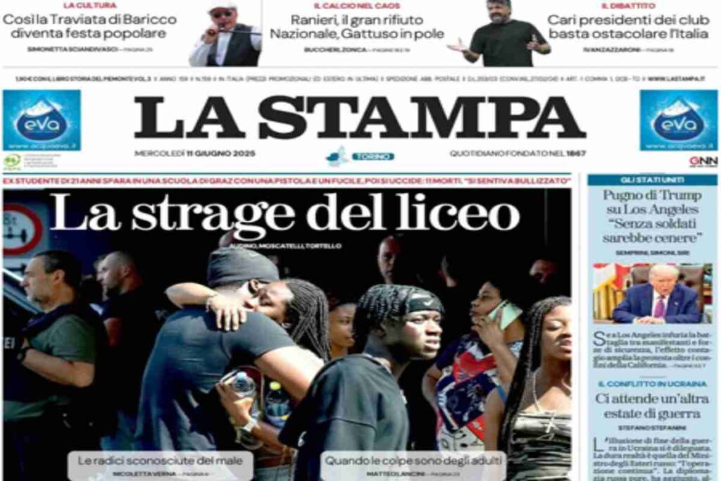 Sono diverse le notizie di oggi in apertura sui quotidiani: la strage in una scuola di Graz, in Austria, dove un ex studente ha sparato a ragazzi e insegnanti uccidendo dieci persone; i rapporti nel centrosinistra dopo il fallimento dei referendum e i diversi pareri nella maggioranza riguardo alla proposta della presidente del Consiglio Giorgia Meloni di ridurre le tasse al ceto medio; Le proteste contro gli arresti degli immigrati irregolari in California e la decisione del presidente degli Stati Uniti Donald Trump di inviare la Guardia Nazionale e i marines per riportare ordine. “La strage del liceo”, titola La Stampa. “Tensioni dopo il referendum”, è l’apertura del Corriere della Sera. “Vogliono abrogare Schlein”, è invece la prima pagina di Libero.