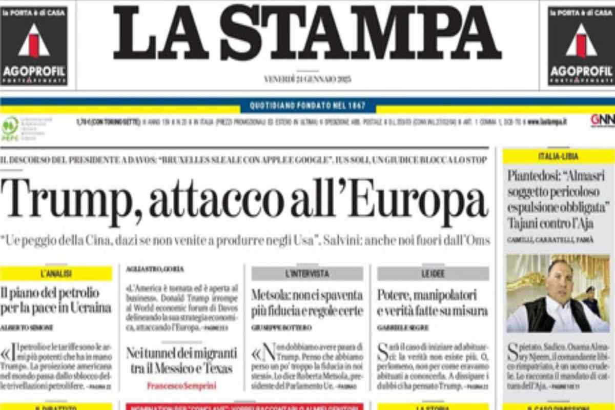 L’intervento al World Economic Forum di Davos del Presidente degli Stati Uniti Donald Trump, che ha parlato dei rapporti fra l’Europa e Usa e delle trattative per arrivare a una pace fra Russia e Ucraina. La liberazione del capo della polizia giudiziaria libica Almasri e le parole del ministro Piantedosi sull’espulsione. La vicenda giudiziaria che riguarda la ministra Santanchè. Sono questi gli argomenti principali sulle prime pagine di oggi. “Trump, attacco all’Europa”, titola La Stampa. Il Corriere: “Scontro con la Corte dell’Aia”. “Santanché: 2,6 milioni senza nome a Visibilia” è l’apertura del Fatto Quotidiano.