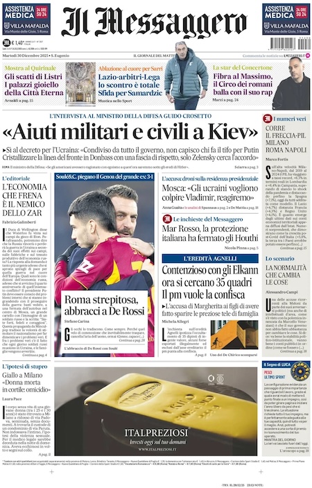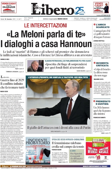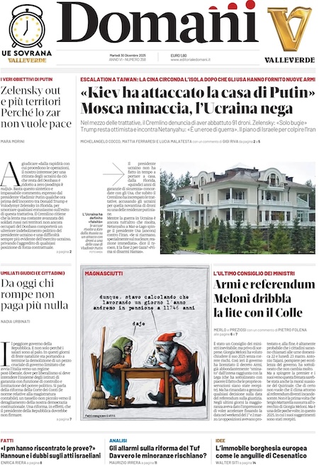 “Guerra fino al 2029. Il conflitto infinito che fa tremare tutti”, di Mario Sechi: “Vero e falso in guerra si mischiano, il conflitto tra Russia e Ucraina non fa eccezione. Sferrare un attacco sulla dacia di Putin a Valdai (una fortezza protetta da 12 torri con sistemi anti -missile) mentre in Florida si discute un piano di pace, è un’operazione illogica sul piano dei tempi (e degli obiettivi militari) e per questo appare incredibile”.