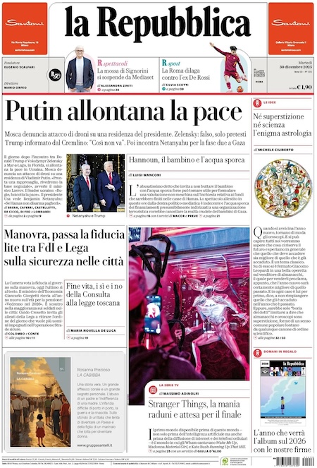 La notizia principale di oggi in apertura sui quotidiani è quella relativa alle dichiarazioni del ministro degli Esteri russo Sergei Lavrov, che ha accusato l’Ucraina di aver attaccato con i droni una residenza del presidente Vladimir Putin. Kiev ha respinto ogni accusa. “Ucraina, Trump alza la voce”, titola La Stampa. “Mosca accusa, gelo sulla pace”, è l’apertura del Corriere. “Sabotaggio alla pace: 91 droni su casa Putin”, è la prima pagina del Fatto Quotidiano.