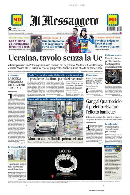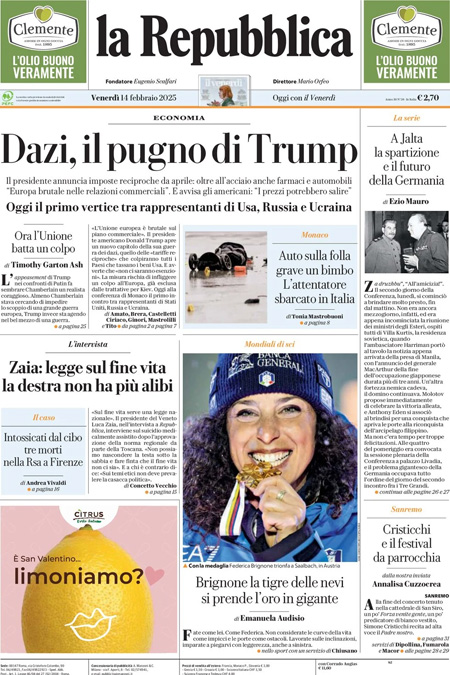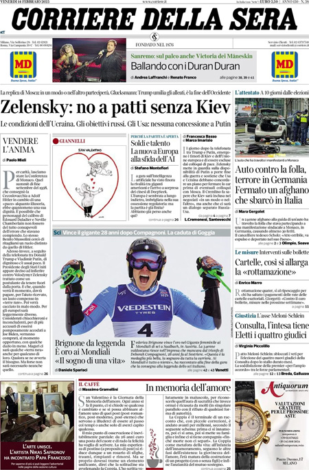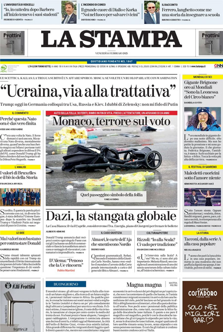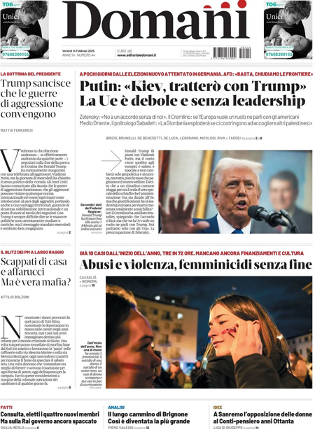 In apertura, oggi i quotidiani si dedicano a diversi argomenti come la trattativa iniziata con la telefonata fra Trump e Putin per arrivare a una tregua nella guerra, il ruolo marginale finora dell’Unione Europea e l’annuncio di Trump di nuovi dazi che dovrebbero entrare in vigore da aprile. “Dazi, il pugno di Trump”, titola Repubblica. “Zelensky: no a patti senza Kiev”, è l’apertura del Corriere della Sera. “Rischi di pace in Ucraina: vedove di guerra in lutto”, titola invece Il Fatto Quotidiano.