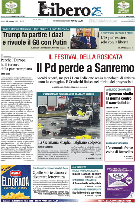 “Perché l’Europa ha il terrore della pax trumpiana”. L’editoriale di Mario Sechi: “La pax trumpiana non piace all’Europa per due motivi: costa, impone di riscrivere tutta la politica di spesa – a cominciare da quella per il welfare, fonte di enormi sprechi e inefficienze – e riporta le cancellerie del Vecchio Continente di fronte alle conseguenze economiche della guerra e della pace. L’iniziativa di Donald Trump ha innescato la reazione isterica: sul piano “resort a Gaza”, il Presidente viene accusato di aver inaugurato la «diplomazia immobiliare»; sull’Ucraina di aver concertato la svolta con Vladimir Putin contro Kiev e l’Europa”.