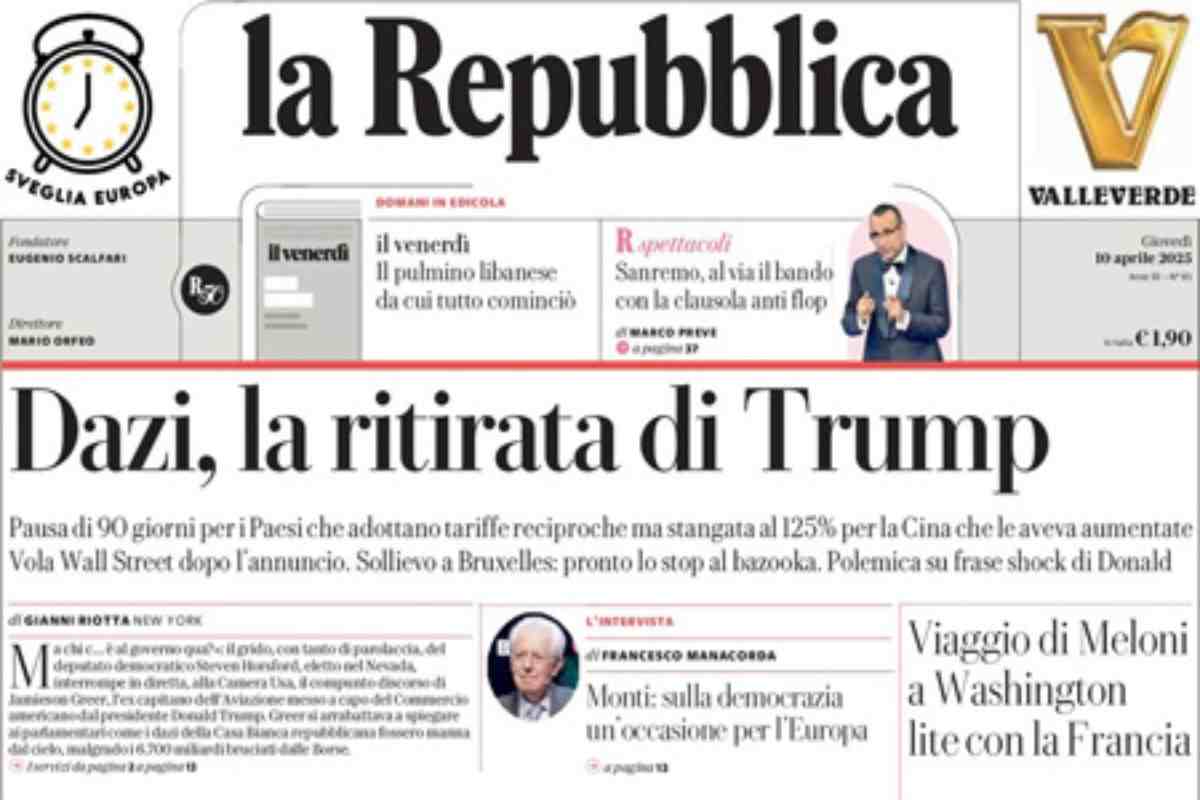 L'EDICOLA, Repubblica: "Dazi, la ritirata di Trump". Il Corriere: "Trump a sorpresa: tregua sui dazi". La Verità: "America e Cina, è resa dei conti. Trump congela i dazi agli altri" - Blitz Quotidiano