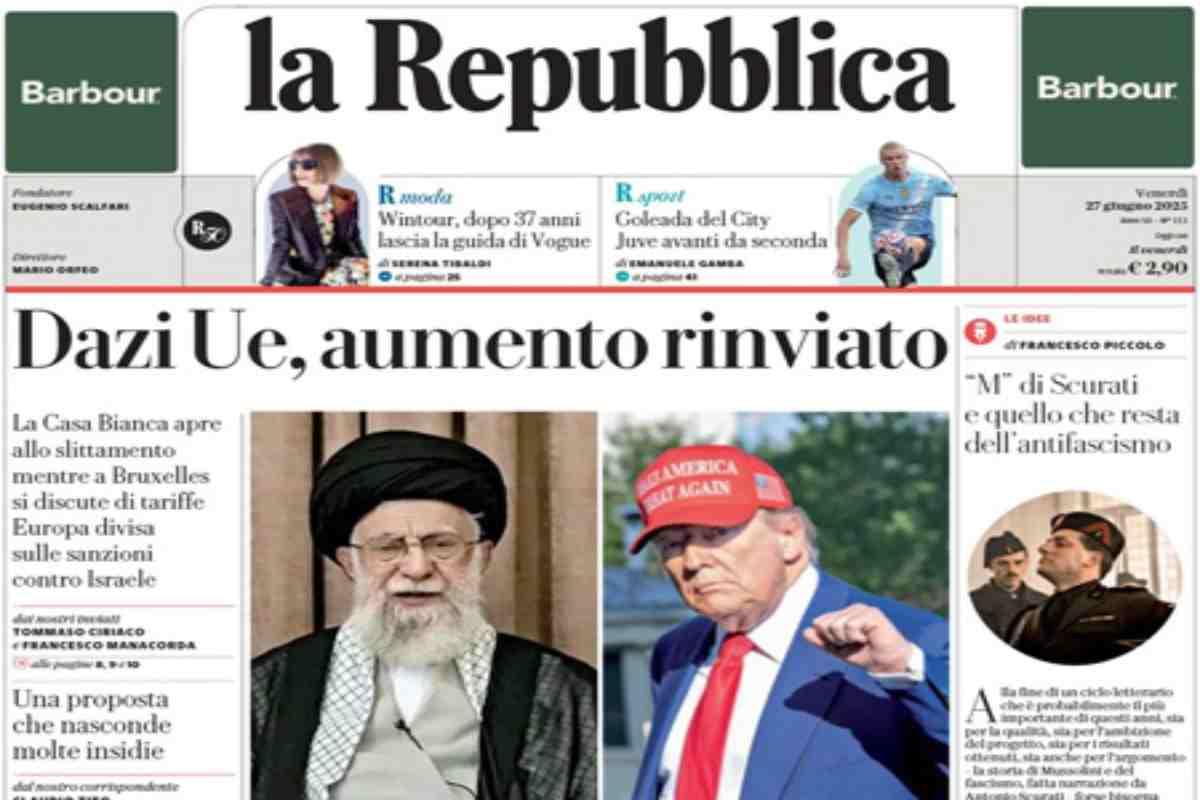 L'EDICOLA, Repubblica: "Dazi Ue, aumento rinviato". La Stampa: "Sanzioni a Israele, la Ue si spacca". La Verità: "In Germania retate all'alba contro la libertà di parola" - Blitz Quotidiano